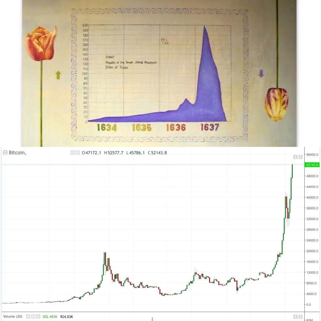 ¿Y que tiene que ver la gráfica? Si ponemos atención a estas imágenes nos podemos percatar que hay una tendencia muy similar entre el valor de los tulipanes y el bitcoin pero la diferencia radica únicamente en que tienen más de 300 años una de la otra.